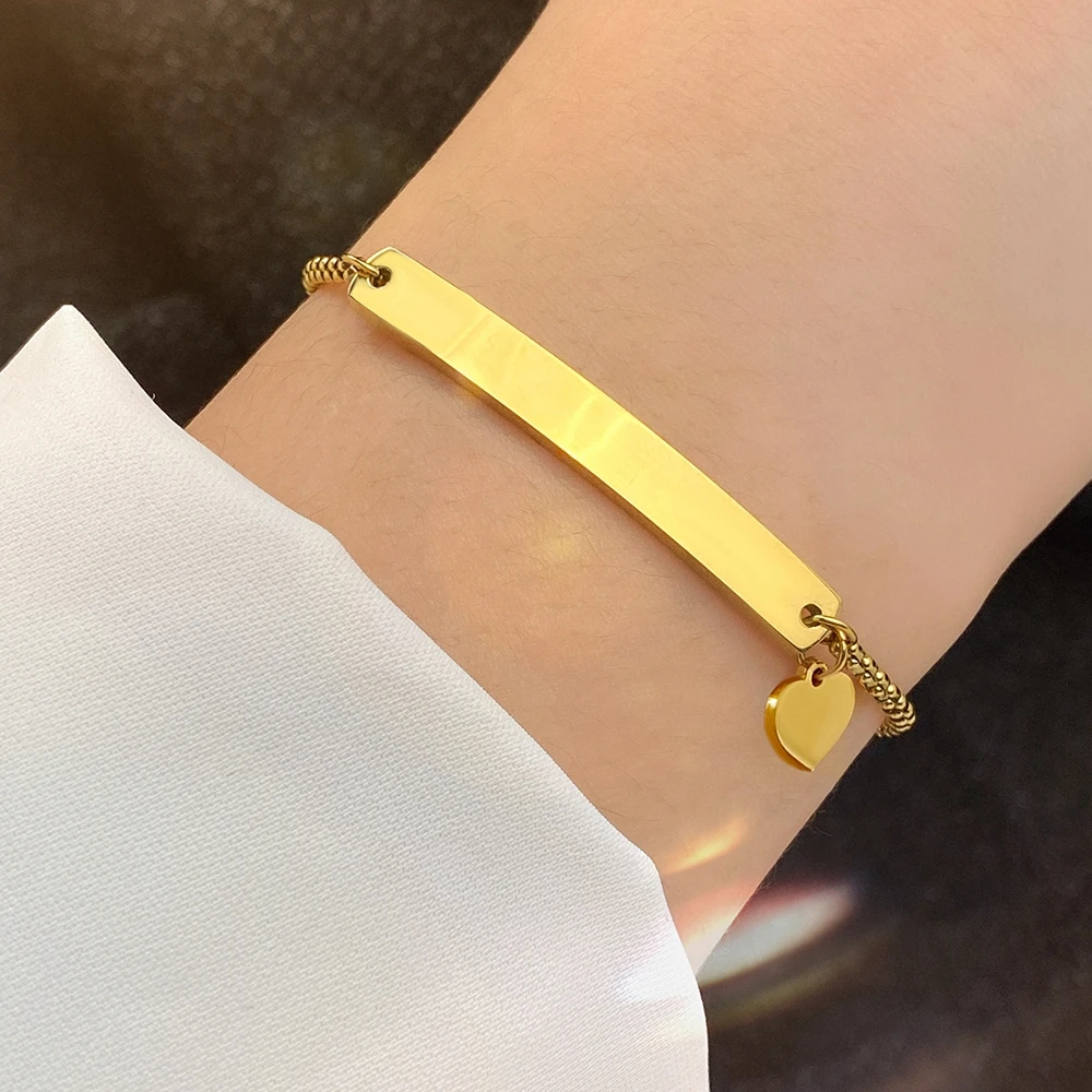 - Features a sleek engraved bar centerpiece accented with a charming tiny heart pendant.